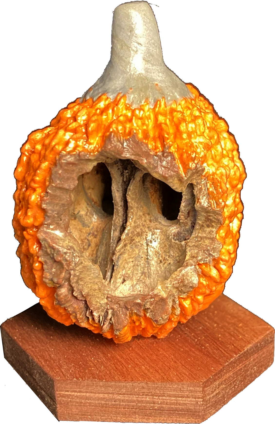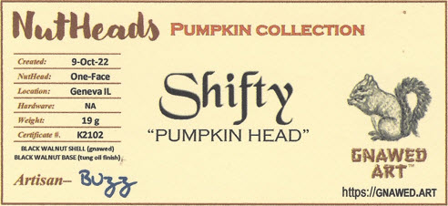 As with all Pumpkin members, Shifty is mounted on a solid black walnut base that is lightly rubbed with tung oil. The base is cushioned with dark brown flocking fibers. As presented, Shifty stands 57 mm tall and weighs 23 grams. The item ships with an original Ownership Certificate.